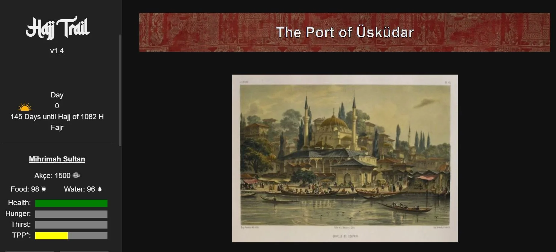 This game similarly explores the social and cultural history of the Ottoman world using the hajj journey as an interpretative foil - however, The Hajj Trail is primarily text-based and was developed with the open-source program Twine.